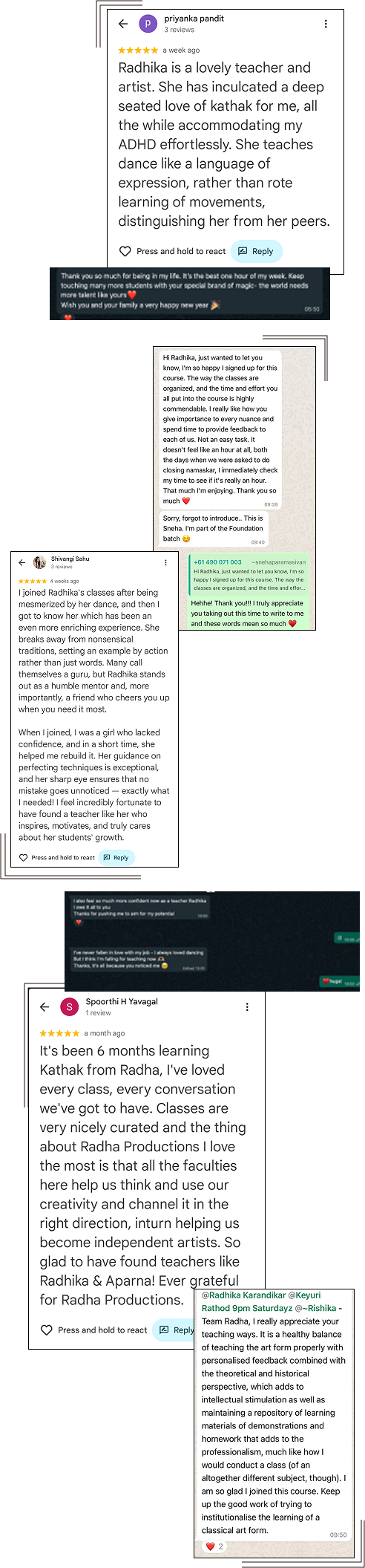Studying Kathak with Radhika hasquickly become one of thebest learning experiences I’ve had.Not only is she an inspiring dancerand human being, she is also a tremendouslygenerous teacher.I am very grateful —and my love for Kathak growsas the weeks go by!